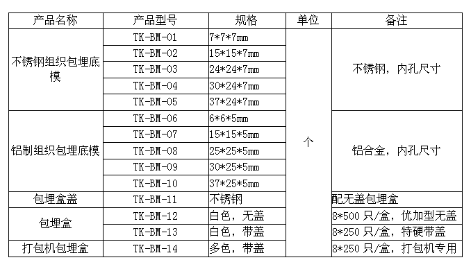 一、病理組織包埋盒、包埋盒蓋、包埋底模主要參數(shù)